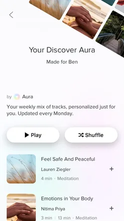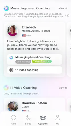 Here is the Aura app with the suggested coaches for the moment. Each coach profile includes the following details: